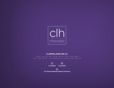 CLHMIDLAND.ON.CA 33 9 rue OLIVE, MIDLAND , ON L4R 2R4 7 05.5 26.425 3 • CLHMID@CLHMIDLAND . ON. CA @CLHDSS @CLHDSS CLH Developmental Support Services